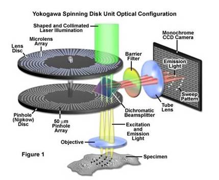 放置于显微镜焦平面的Nipkow双转盘,扫描转盘有2万个按等速角螺旋线分布的针孔,聚光转盘放置有与针孔位置精确对中的微聚透镜。两个转盘同步高速旋转,激发光与发射荧光均经过针孔,采用单光子探测器(EMCCD),一次曝光获取2D共聚焦图象。共聚焦扫描单元为Yokogawa的CSU-W1系列。CSU-W1扫描速度为1500-4000转/分钟,支持图像采集速度为200幅/秒,具有25um和50um两种针孔,和4倍于传统共聚焦扫描单元的视场。 |