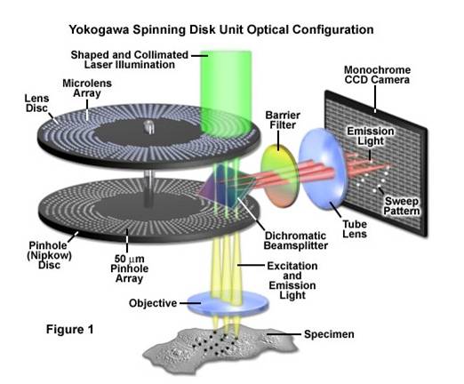 放置于显微镜焦平面的Nipkow双转盘,扫描转盘有2万个按等速角螺旋线分布的针孔,聚光转盘放置有与针孔位置精确对中的微聚透镜。两个转盘同步高速旋转,激发光与发射荧光均经过针孔,采用单光子探测器(EMCCD),一次曝光获取2D共聚焦图象。共聚焦扫描单元为Yokogawa的CSU-W1系列。CSU-W1扫描速度为1500-4000转/分钟,支持图像采集速度为200幅/秒,具有25um和50um两种针孔,和4倍于传统共聚焦扫描单元的视场。